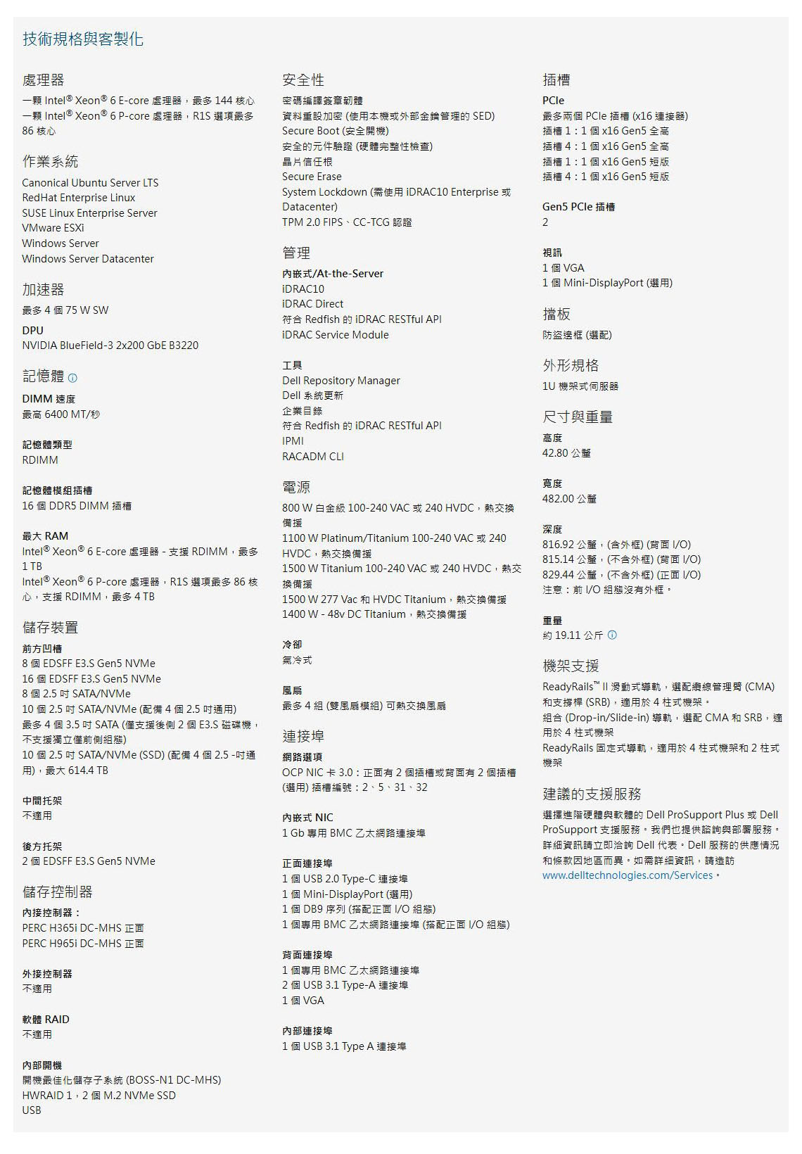 - 處理器:一顆 Intel® Xeon® 6 E-core 處理器,最多 144 核心,一顆 Intel® Xeon® 6 P-core 處理器,R1S 選項最多 86 核心